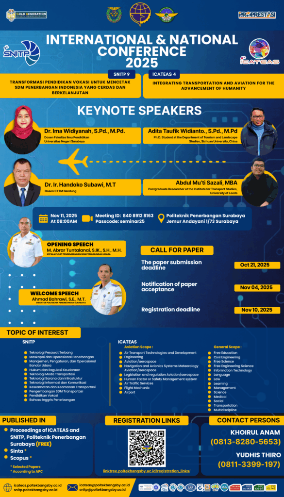ICATEAS (4th International Conference of Advanced Transportation, Engineering, and Applied Social Science) is the fourth international conference organized by the Aviation Polytechnic of Surabaya, an official university under the Ministry of Transportation, Republic of Indonesia.